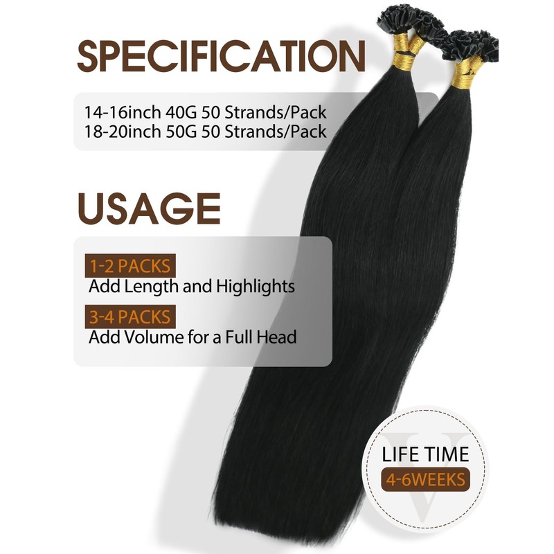 - Hair specifications: VINBAO U-tip hair extensions 40 g for 14-16 inches, 50 g for 18-20 inches, 50 strands/pack. We recommend 1-2 packs to add volume and highlights, 3-4 packs for a full head