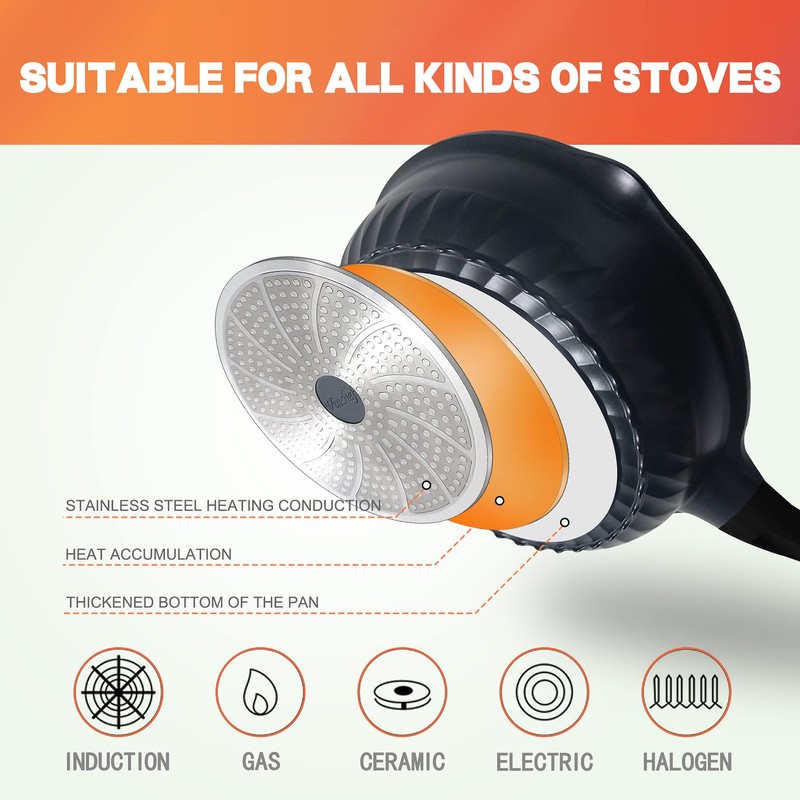 - 【Effective Non-stick, Easy to Clean】German greblon non-stick coating is wear-resistant and non-stick, and frying is non-stick for a long time. No welding, no rivets, stronger pot handles and easier cleaning.