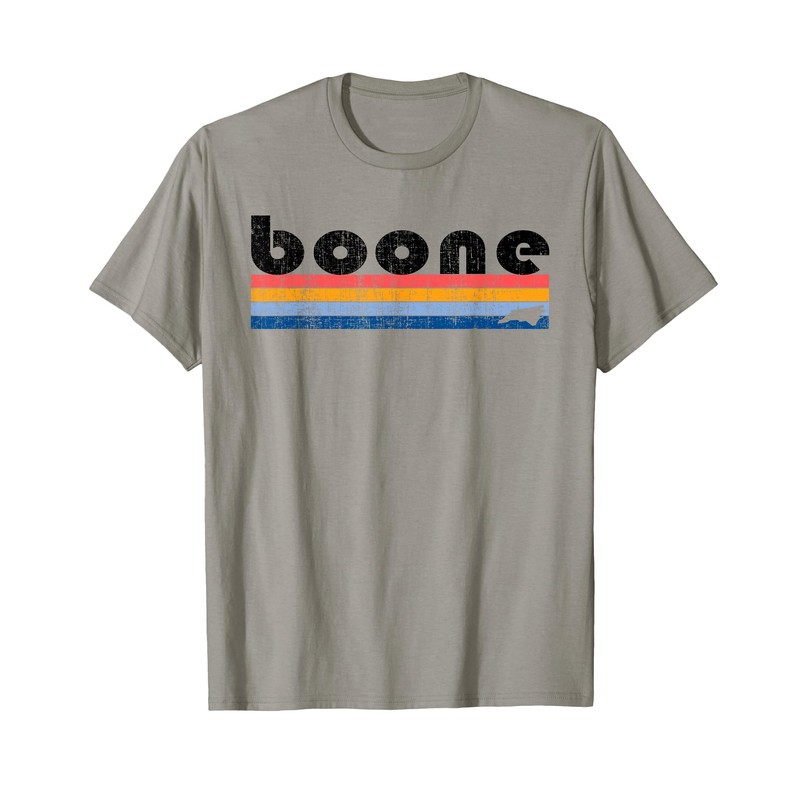 • The perfect Boone North Carolina souvenir t-shirt - gift t-shirt. This retro tee has Boone in a cool retro font with colored stripe underlining. This graphic is distressed to give it a vintage classic look that everyone will love!