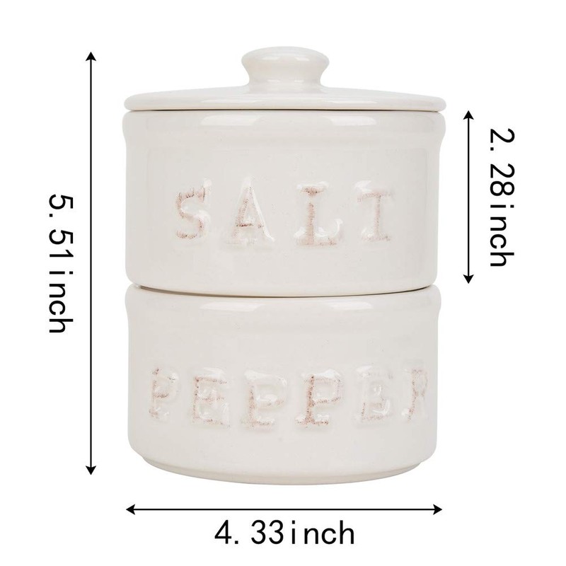 - DIMENSIONS:The salt and pepper containers measure 4.33”(Dia) x 5.51”(Height),2.28"(Height) each tiers ,Material: Ceramic Color: White. Food Safe.