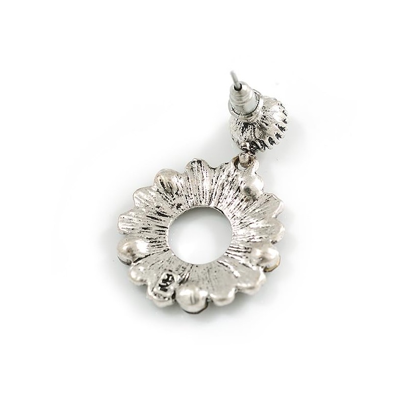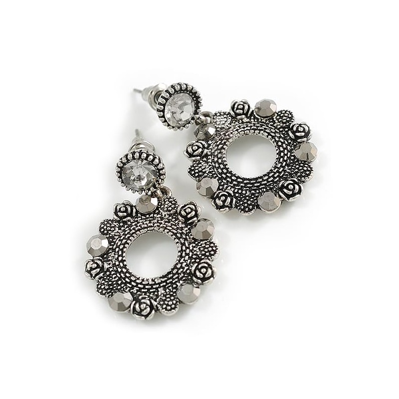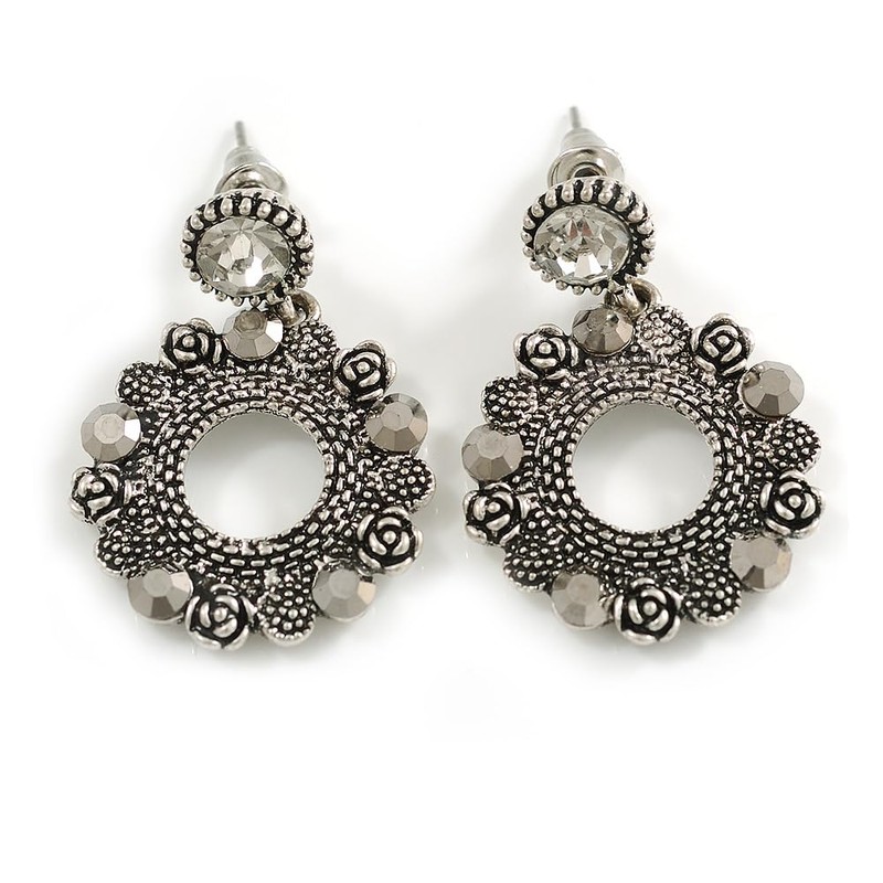 Vintage Inspired Textured Circles with Hematite Crystals Drop Earrings in Aged Silver Tone - 35mm L
