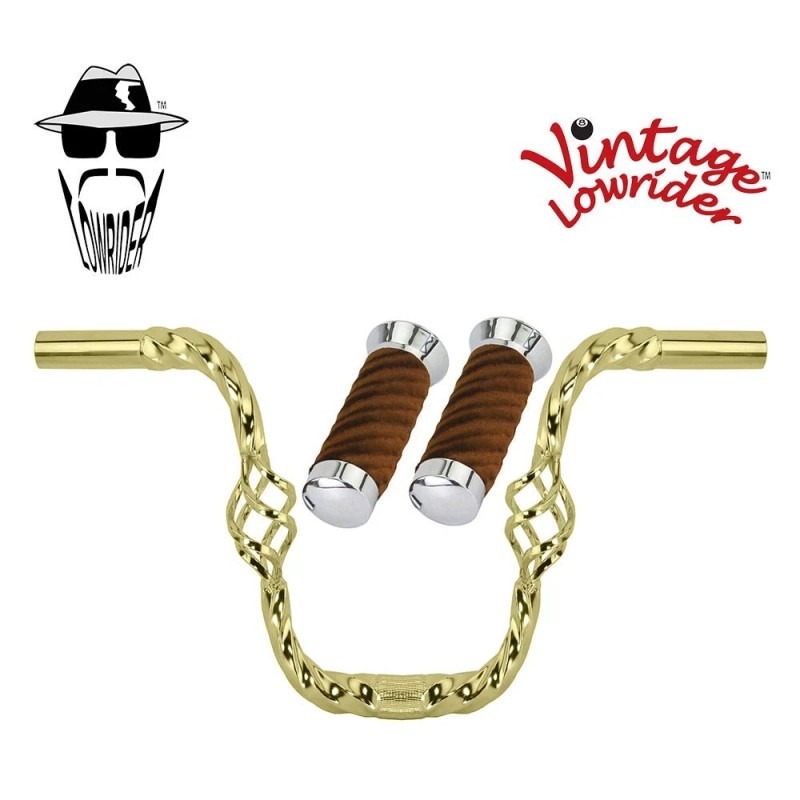Vintage Lowrider Handlebar Square Twisted w/Cage 9" 25.4mm Gold, Brown Grips Velour Swirl
