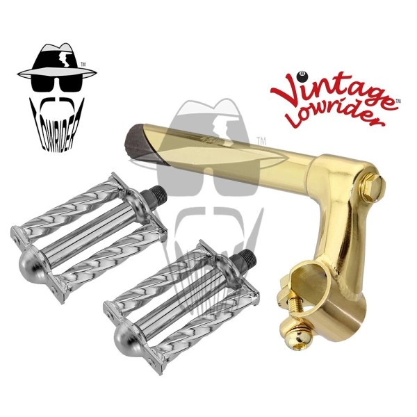 Vintage Lowrider Stem Classic 22.2 Gold & Pedals Square Twisted 9/16" Chrome