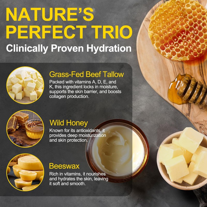 - Nutrient-Rich Grass Fed Beef Tallow Honey Balm for Skin: Our balm is crafted from grass-fed beef tallow, packed with natural fatty acids and vitamins to deeply nourish your skin, enhancing elasticity and softness.