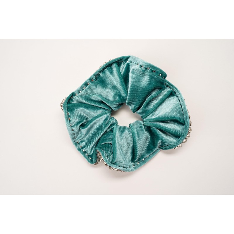 - Get Glam: This scrunchie is adorned with sparkling crystals and made of luxurious velvet fabric, making it perfect for adding a touch of glamour to any outfit. The Details: Velvet 5" Scrunchie with 5mm Crystal Rhinestones