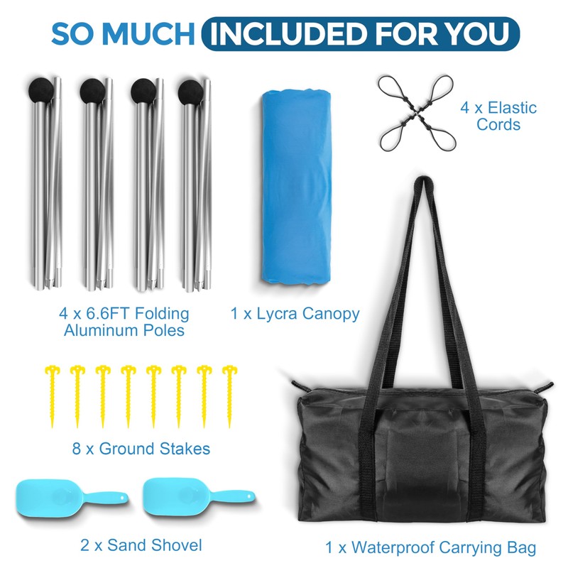 This portable beach canopy tent is made of high-elastic Lycra fabric which blocks up to 98% of harmful UV rays,keeping you and your family from the harmful UV rays and reducing sunburn or glare. The pole of our beach tent canopy is powder-coated which is rust-resistant and comes with sandbags and stakes allowing for versatile usage on sandy beaches,lush grassy areas,or even rocky camping sites.Great suitable for family and friends outdoor gatherings.