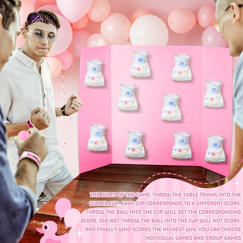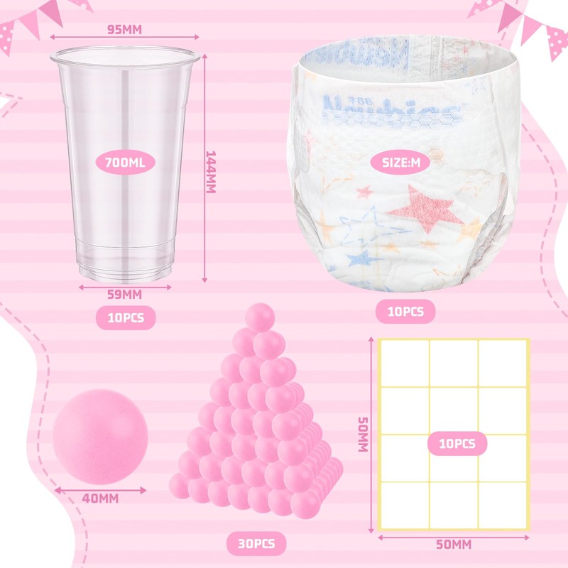 - Baby Shower Diaper Games Kits: use our funny baby shower game party supplies to make your baby shower experience enjoyable and exciting; The set includes 10 pcs diapers, 10 pcs clear cups, 30 pink balls and 10 pcs sticky notes, you can DIY a fun baby shower game; Notes: our baby shower game set does't include game board, you need buy from other shop