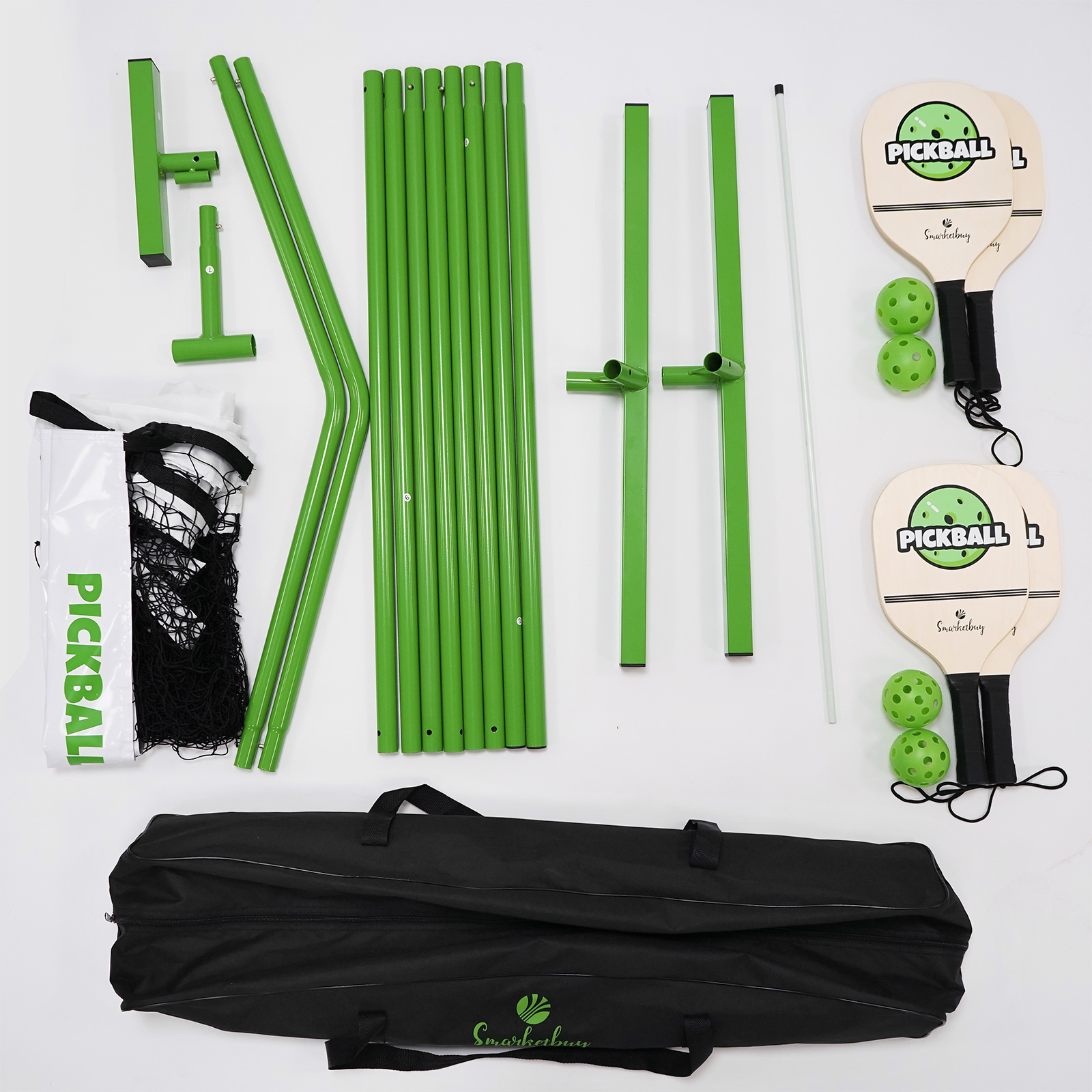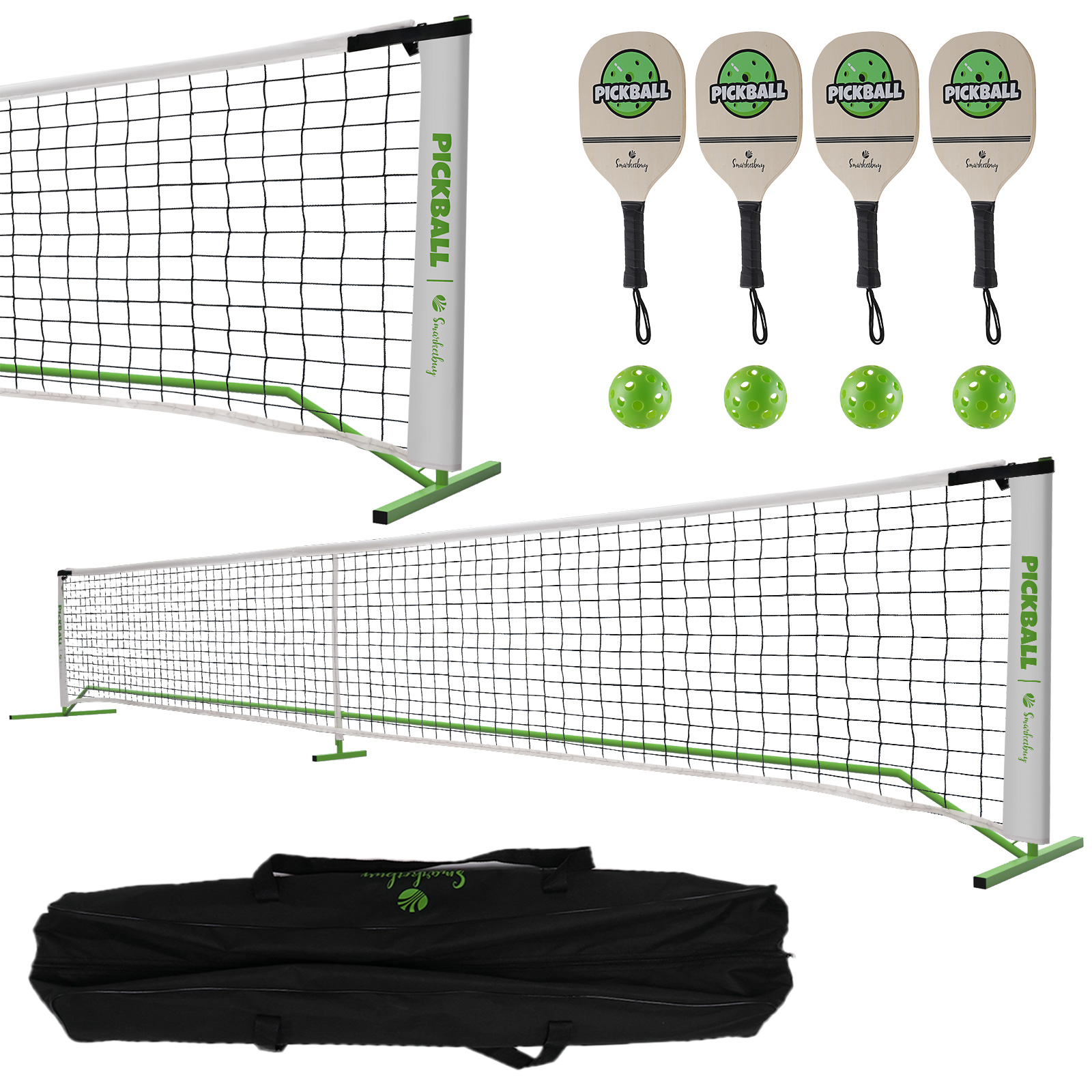 Complete Pickle ball Net: Includes 1 Portable Net System with Carry bag + 4 wooden Pickle ball Paddles + 4 Outdoor Pickle balls.