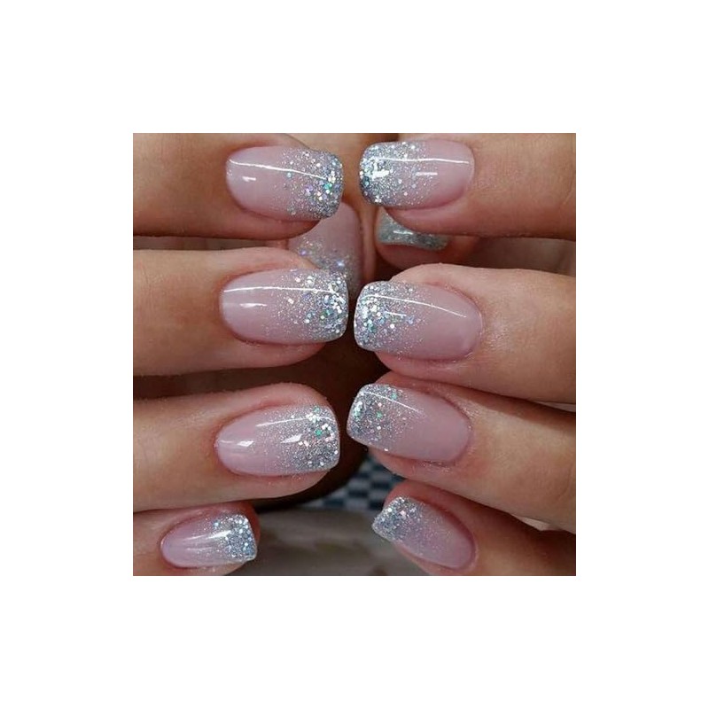 Virellay Glossy False Nails Short (Silver Glitter Ombre, Pack of 24)