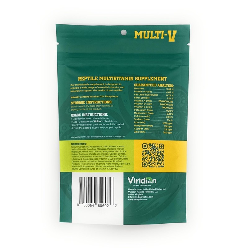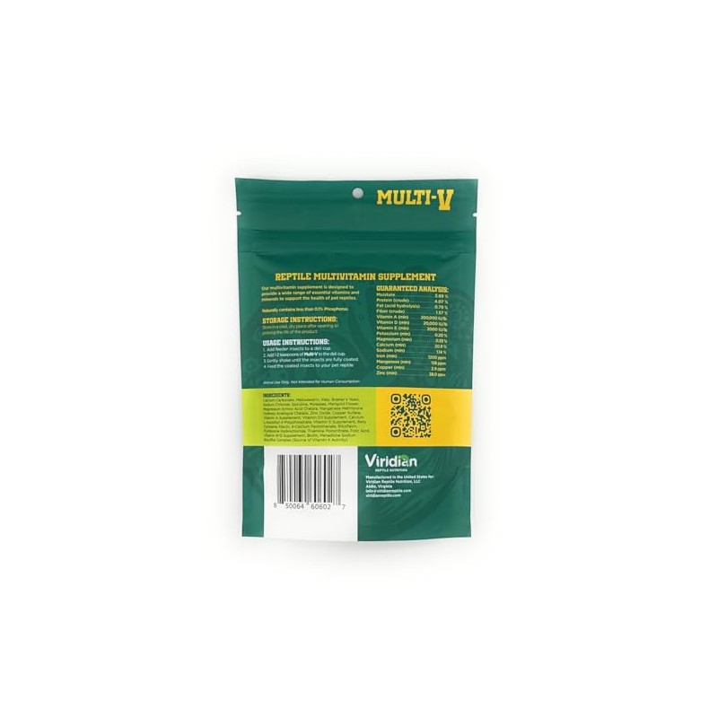Viridian Reptile Nutrition Reptile Multivitamin Enhance your reptile’s health with Viridian Multi-V Reptile Multivitamin Supplement, a premium dietary solution designed to provide a balanced mix of essential nutrients. Packed with vital vitamins such as A, D3, and E, this supplement supports strong bones, healthy skin, and sharp vision. Its easy-to-use formula allows you to effortlessly dust feeder insects for optimal nutrient absorption. With a low-phosphorus composition (<0.1%), Multi-V ensures a safe, well-rounded diet for all pet reptiles. Crafted for quality and effectiveness, this supplement is the perfect addition to your reptile care routine.