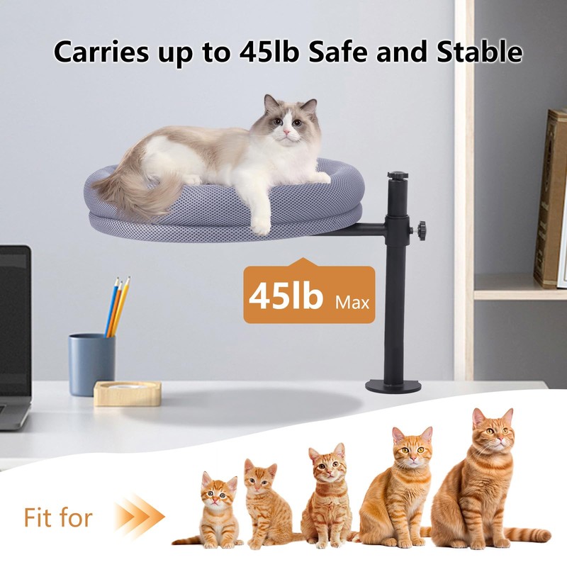 - Sturdy and Space-saving: Made of premium fabric and sturdy iron frame, the desk cat bed can support up to 45 pounds, ensuring long-term use and stability for your feline friend. Simply attach this desktop cat bed to your table and adjust it to your preferred position. The spacious 16.1x16.1x2.8-inch round desk cat bed attachment is made of soft fabric to provide comfort for cats of all ages and breeds