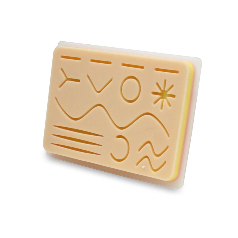 - 5” X 7” silicon suturing pad, 14 pre-cut wounds of various types of width, depth and lot of space to add additional cut