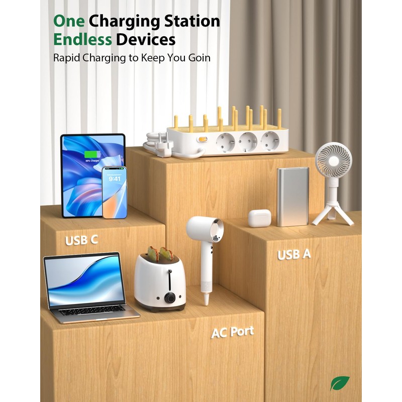 • ??Lieferumfang??1 USB C Ladestation mit AC Steckdosen, 1 abnehmbare Ladest?nderabdeckung, 18 St1ck nat1rliches Bambusholz (9 St1ck lang + 9 St1ck kurz) und 6 kurze Ladekabel (2 kompatibel mit lPhone, lPad, 1 Typ C). und 3 St1ck USB C auf USB C) f1r mehrere Ger?te, Servicekarte, Benutzerhandbuch.