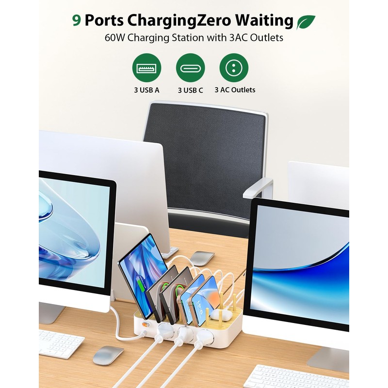 VisionSync VisionSync Bamboo 60W 6 Port USB C Ladestation f1r mehrere Ger?te, 20W PD Ladedock mit 3 AC Steckdosen, 3 USB C, 3 USB A, 2m Netzkabel f1r lPhone,lPad,Tablets... (6 gemischte Kabel), Wei?