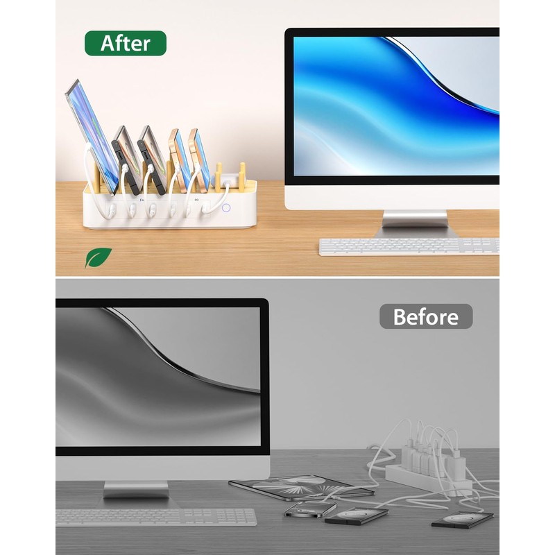 • ??Keep your charging neat and organised?? Verabschieden Sie sich von un1bersichtlichen Kabeln und Ladeger?ten, halten Sie alles an einem Ort, ordentlich und organisiert. Setzen Sie 18 nat1rliche Bambusst?be nach Belieben ein. Die abnehmbare Ladest?nderabdeckung kann flexibel Ihre verschiedenen Arten von Telefon-/Tablet-H1llen unterst1tzen.