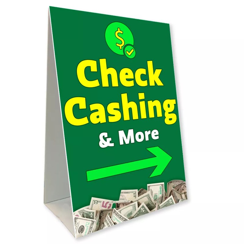 This product listing is for our Check Cashing Economy A-Frame Sign . This double-sided sign is made of corrugated plastic so it is water-proof and is excellent for display either outdoors or inside; on sidewalks, near the curb, or if front of your store or display area. Our Economy A-Frame Sign (AKA Sandwich Board Sign) family of products all fold flat for easy storage, so they are very portable, set up quickly, are brightly printed to attract attention, and can be used for short-term or long term signage. This A-Frame sign is 24" wide and 36" tall. This size is an industry standard and is roughly the same size as the heavy, cumbersome, plastic a-frame signs. The same image is printed on the front and back unless the design has an arrow. Designs with arrows are printed so that both sides point the same direction. All of our Economy A-Frame signs are printed on light-weight corrugated plastic (coroplast) making them a perfect choice for affordable indoor or outdoor signage. These signs are easy to set up, to take down and to store. They fold flat for easy transportation and storage. Once set up their bright colors and professional graphics really gets your message noticed.These signs are very light weight so for outdoor use will need to be weighed down with something heavy - like a rock, brick, block or our sandbag (sold separately).