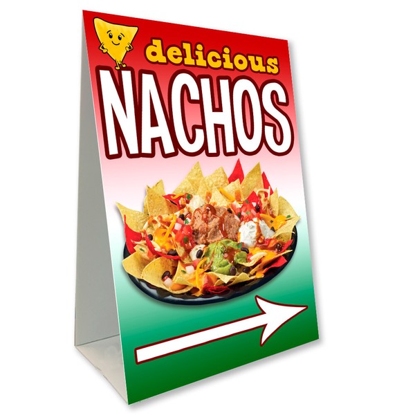 This product listing is for our Nachos Economy A-Frame Sign . This double-sided sign is made of corrugated plastic so it is water-proof and is excellent for display either outdoors or inside; on sidewalks, near the curb, or if front of your store or display area. Our Economy A-Frame Sign (AKA Sandwich Board Sign) family of products all fold flat for easy storage, so they are very portable, set up quickly, are brightly printed to attract attention, and can be used for short-term or long term signage. This A-Frame sign is 24" wide and 36" tall. This size is an industry standard and is roughly the same size as the heavy, cumbersome, plastic a-frame signs. The same image is printed on the front and back unless the design has an arrow. Designs with arrows are printed so that both sides point the same direction. All of our Economy A-Frame signs are printed on light-weight corrugated plastic (coroplast) making them a perfect choice for affordable indoor or outdoor signage. These signs are easy to set up, to take down and to store. They fold flat for easy transportation and storage. Once set up their bright colors and professional graphics really gets your message noticed.These signs are very light weight so for outdoor use will need to be weighed down with something heavy - like a rock, brick, block or our sandbag (sold separately).