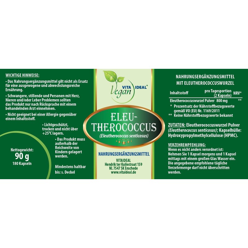VITA IDEAL Vegan® Eleutherococcus 180 Capsules Taiga Root - Eleutherokokk - Senticosus - Daily Serving 800 mg Pure Powder. Natural, Vegetable and No Additives, Original by VitaDeal