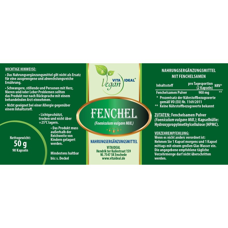 VITA IDEAL Vegan® Fennel Seeds 90 Capsules Foeniculum Vulgare Daily Serving 900 mg Fennel Seeds Pure Powder Natural, Vegetable and No Additives, Original from Vitadeal.