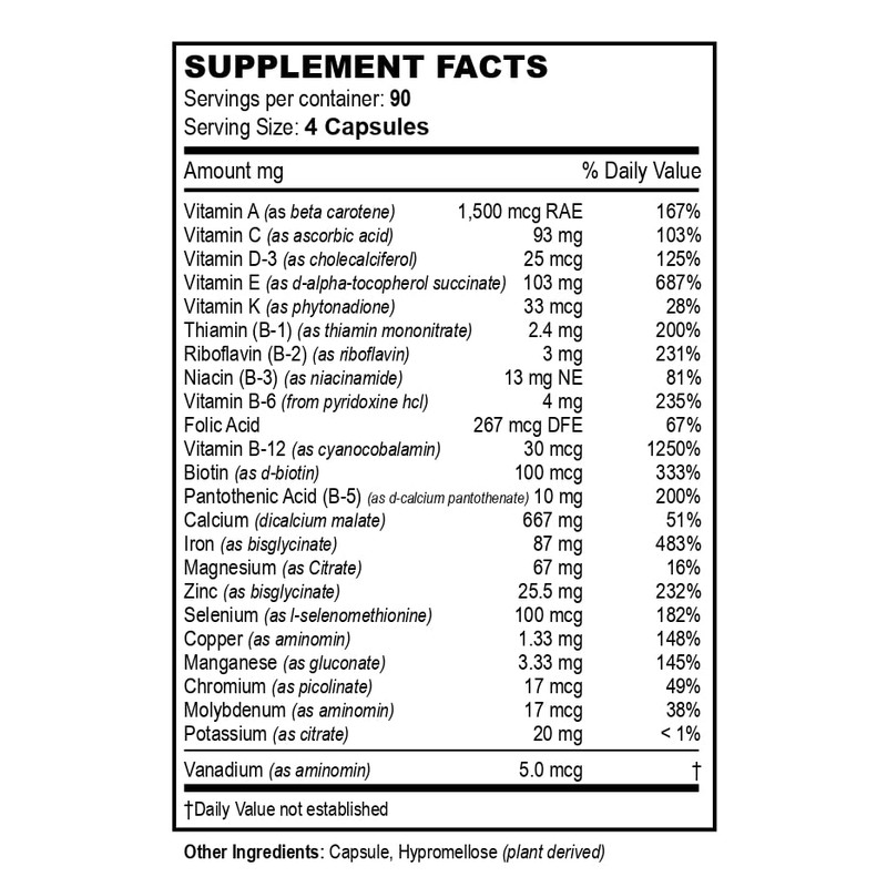 • Our Multi-Plus multivitamin formula provides high values of essential micronutrients in both fat and water-soluble vitamins and amino acid chelated minerals.