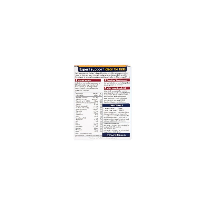 WellKid Chewable also includes vitamins A, C and D, as recommended by the UK Department of Health who advise that all children up to the age of 5 years should be given a supplement that contains these vitamins.
