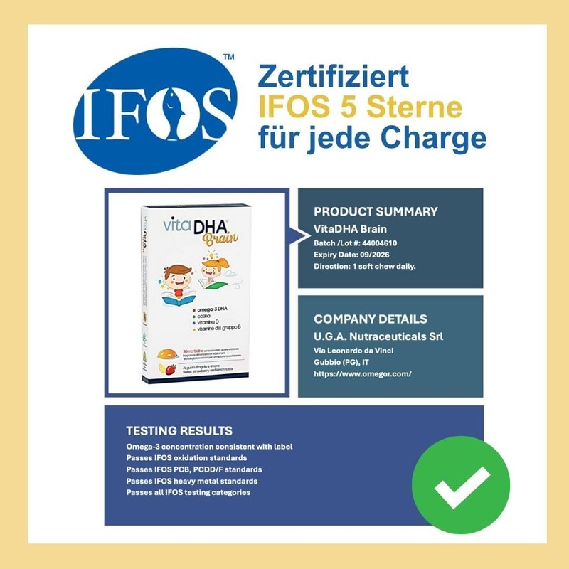- Safety and purity – The fish oil used in VitaDHA Brain is IFOS 5-star certified and guarantees the highest purity and absence of heavy metals and harmful substances through molecular distillation