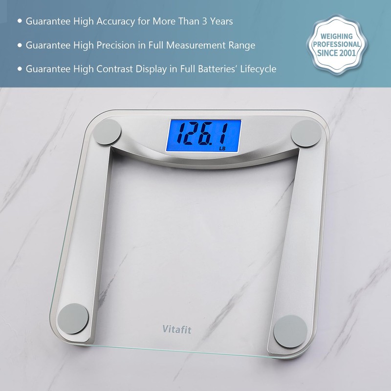 Vitafit Digital Bathroom Weight Scale for Body Weight, High Accuracy Assured by Weighing Professional Since 2001,Extra Large Blue Backlit LCD and Step-On, 400lb/182kg, Clear Glass
