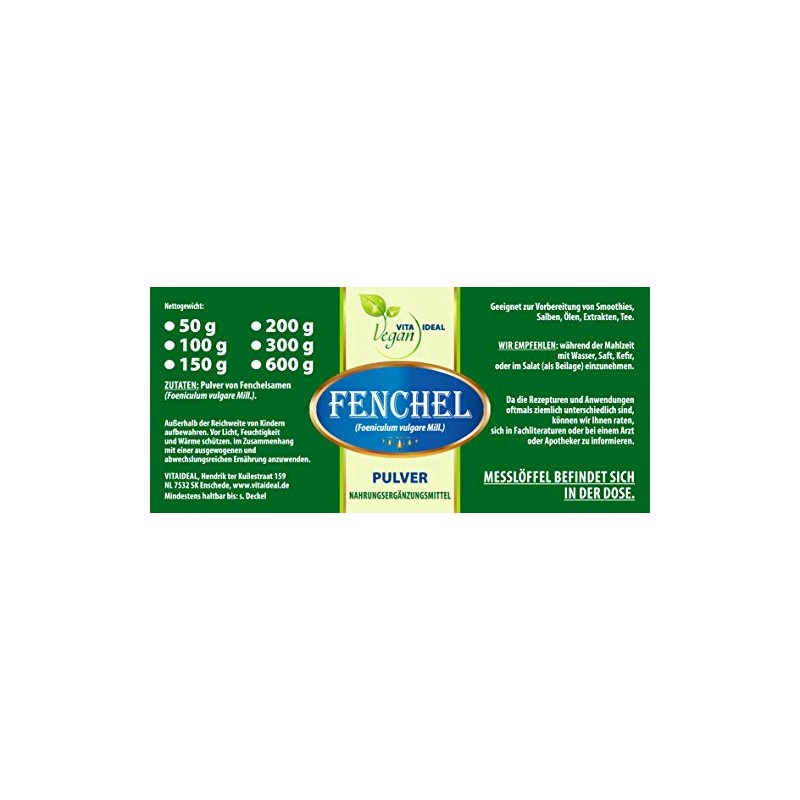 Contents: powder of fennel seeds (foeniculum vulgare), 100% natural, no additives, no fillers, not chemically or artificially standardised, lactose free, fructose free, gluten free. Measuring spoon included