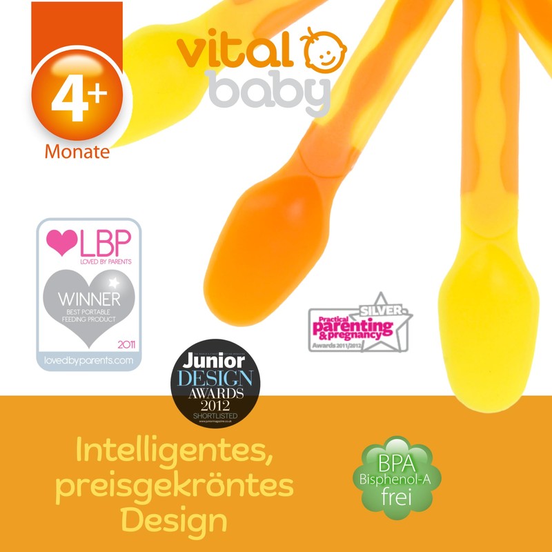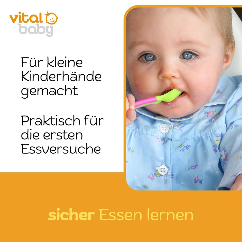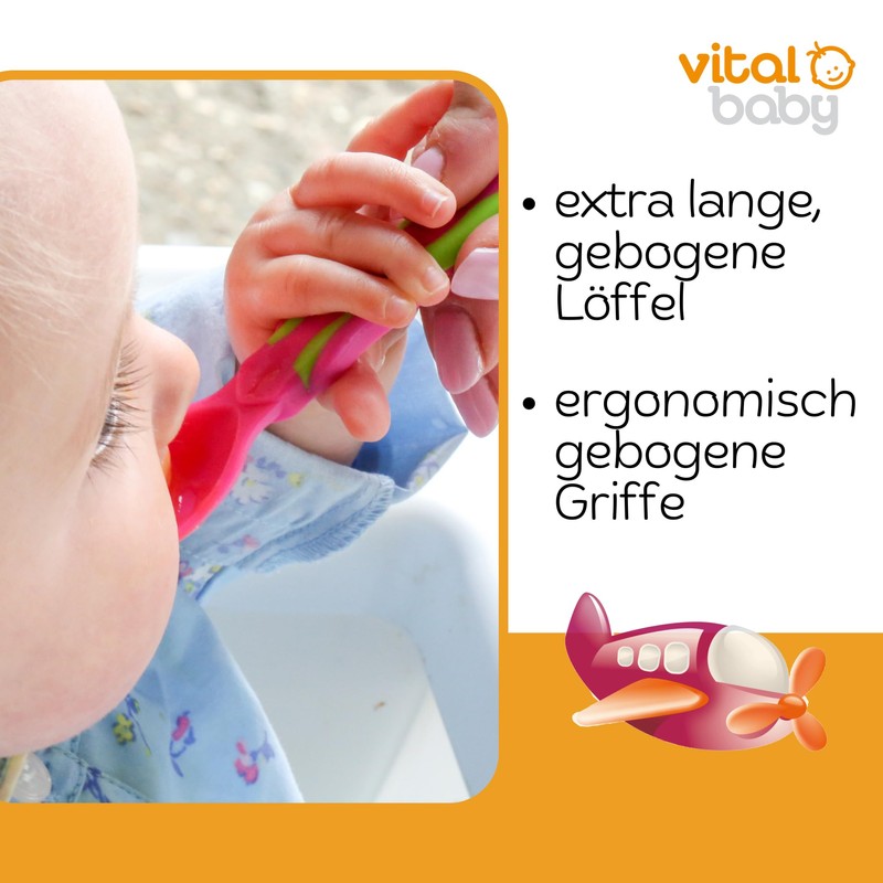 - Relaxed feeding: the "Mama's first spoon" from Vital Baby is perfect for your baby's first feeding attempts. With the extra long FlexiSafe handle, you can feed comfortably and effortlessly while your little one slowly gets used to food.