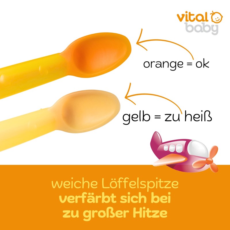 - Temperature control made easy: the Vital Baby heat sensor spoon is a practical tool to check the temperature of the baby food. The soft spoon tip will discolour when the food is too hot, giving you peace of mind that your baby will not burn themselves.