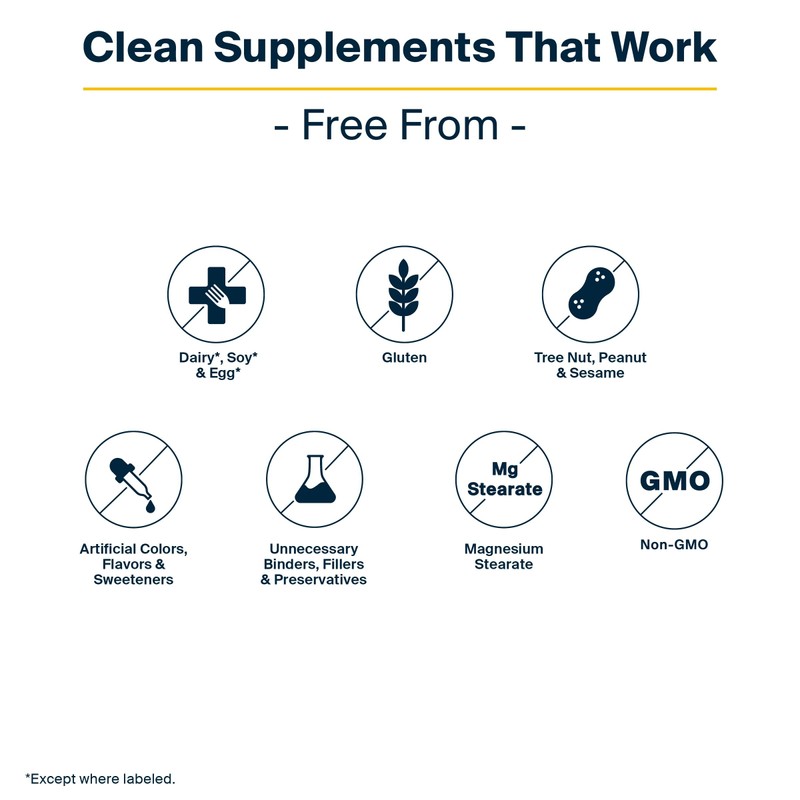 • Clean Formula: Free from gluten, dairy, peanut, tree nut, shellfish, soy, sesame, and egg. Non-GMO. Made without artificial fillers, coatings, binders, or colors