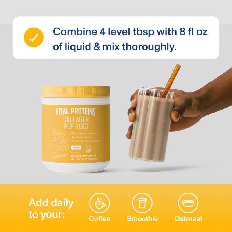 - Easy To Use ---- Vital Proteins Collagen Peptides is easily digested and dissolves in cold or hot liquids, like coffee, tea and smoothies. One to two scoops a day is all you need!