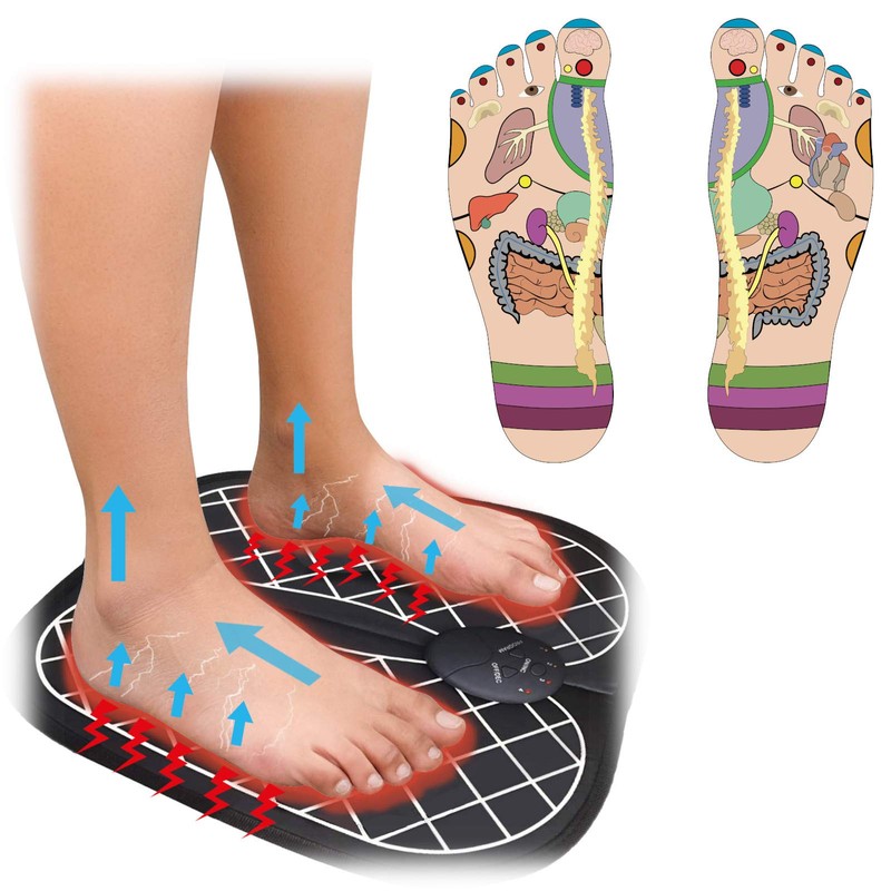 Electrical Muscle Stimulation (EMS), also known as neuromuscular electrical stimulation (NMES), causes muscle contractions through electrical impulses. The impulses mimic central nervous system actions, causing the muscles to contract. EMS is proven to be an effective muscle strengthening tool and to help improve blood circulation. What is EMS used for: Muscle Strengthening. Rehabilitation Purposes. Preventing Muscle Atrophy. Increasing Blood circulation. Relaxation of Muscles. Cosmetic Muscle Toning. Safety: Before use, please read the instruction manual thoroughly to ensure safe and correct use. Please do not use this product on the following body parts as it may injure the area or cause skin injuries. Top areas of the body, such as the chest and shoulders (head, face, etc.) On wounds and eyes, mouth, genital areas, etc. On any area where surgery has been performed Parts of the body that have metal and plastic insertions Areas of the body with tattoos This EMS Unit should never be used as a relief for undiagnosed pain. Please consult your doctor before treating any symptoms of pain. For safe and correct use of the device, please read the manual first. THIS PRODUCT IS COMPLETELY SAFE. DUE TO ITS BATTERY OPERATION, YOU CAN INCREASE THE INTENSITY LEVELS WITHOUT ANY RISK OF ELECTRIC SHOCK. USE ONLY AS DIRECTED. THIS IS NOT A MEDICAL DEVICE. THE INFORMATION PROVIDED HERE IS FOR INFORMATIONAL PURPOSES ONLY AND IS NOT INTENDED AS A SUBSTITUTE FOR ADVICE FROM YOUR DOCTOR OR HEALTHCARE PROVIDER. Never use the foot mat if you suffer the following conditions: If you are pregnant If you have a pacemaker or an automatic implanted cardiac defibrillator (AICD) If you have deep vein thrombosis (DVT) as it can cause blood clots If you have high blood pressure if you have any heart disease.