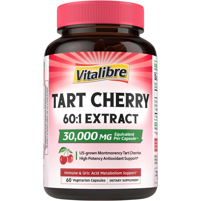 - 30000 mg Strength Tart Cherry: Vitalibre Tart Cherry Capsules are made from 100% whole, freeze-dried tart cherries grown and harvested from orchards in America. Each vegan capsule features a highly concentrated 60:1 ratio of tart cherry anthocyanin extract, equivalent to a whopping 30000 mg of fresh tart cherry fruit