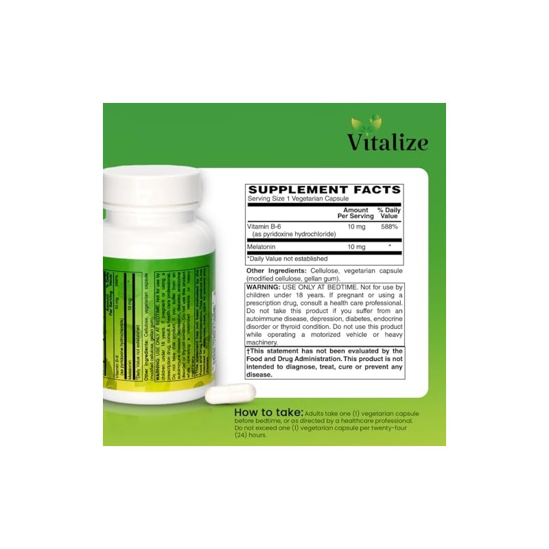 Infuse your nights with quality rest and your days with vibrant health with Vitalize Melatonin 10mg capsules. Our capsules contain the perfect amount of melatonin to enhance your sleep quality, paired with Vitamin B6 for greater bioavailability. Say goodbye to restless nights and groggy mornings. Our formula also offers immune support through natural ingredients and careful formulation!