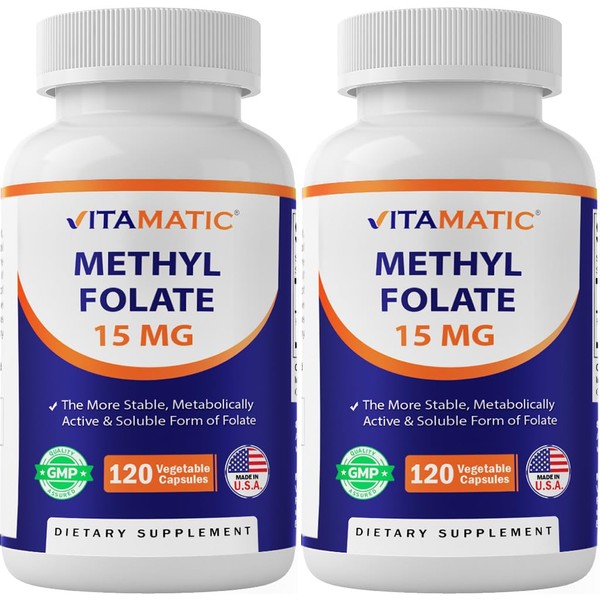 Vitamatic Methyl Folate 15mg – 120 Vegetable Capsules - 2 Pack Optimized and Activated High Potency – Metabolically Active Folate