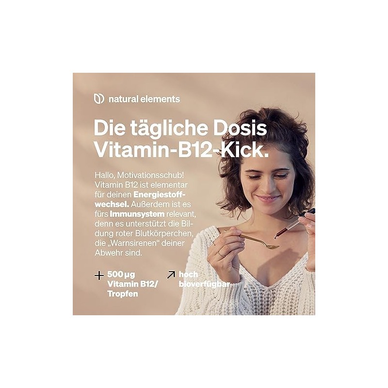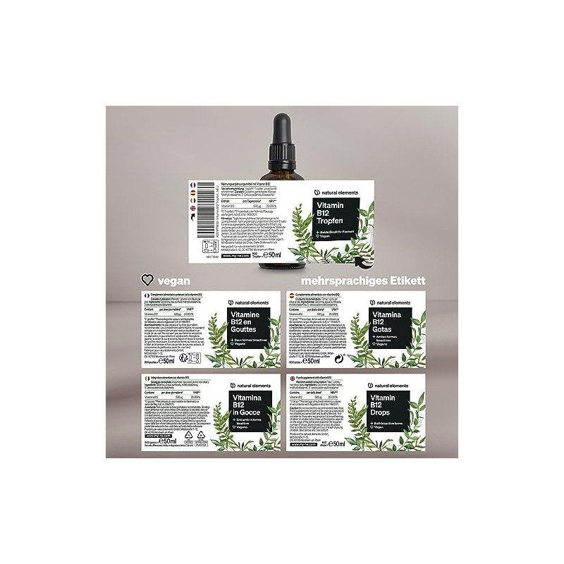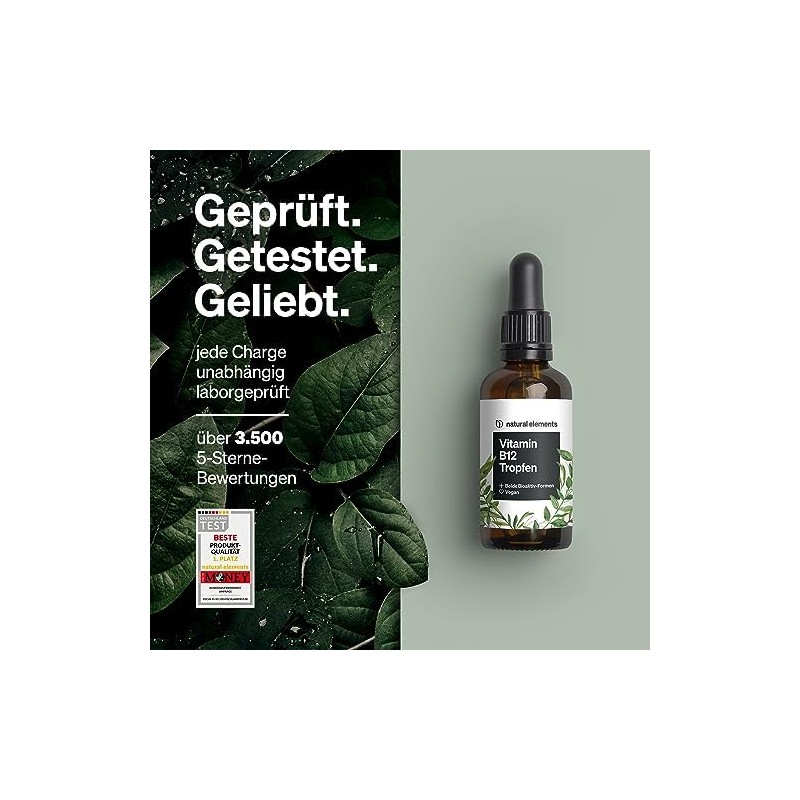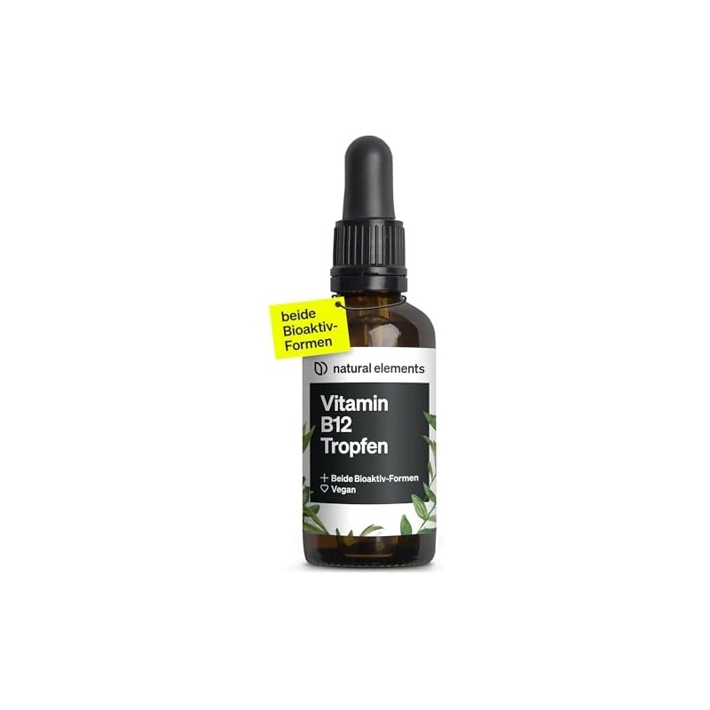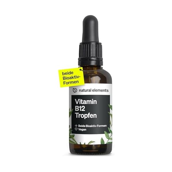 natural elements Vitamin B12 Drops, Vegan, Alcohol-Free, 2 Active Forms (Methyl and Adenosylcobalamin), Carefully Laboratory Tested in Germany, 50 ml (900 Drops)