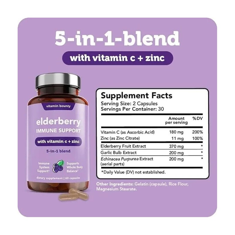 Vitamin Bounty Elderberry Immune Support with Zinc Vitamin C Garlic & Echinacea, 60 Caps - New