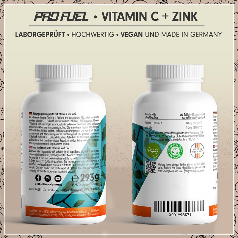 - Optimal high dose: our vitamin C + zinc tablets are optimally high dosage with 500 mg pure vitamin C + 15 mg elemental zinc per tablet. In this way, the vitamin C + zinc tablets not only cover the basic needs of vitamin C and zinc, but also a possible additional requirement due to stress, illness or intense sports.