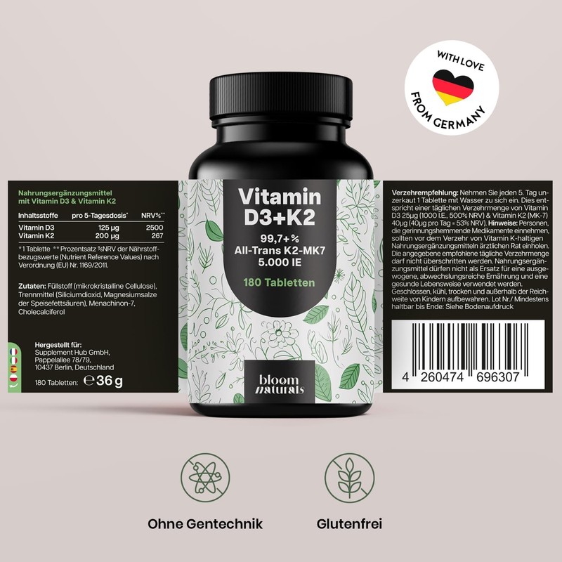 • High-dose formula: our vitamin D3 K2 5000 IU tablets offer a powerful combination to meet your needs. Ideal for anyone looking for a reliable source of vitamin D3 and K2