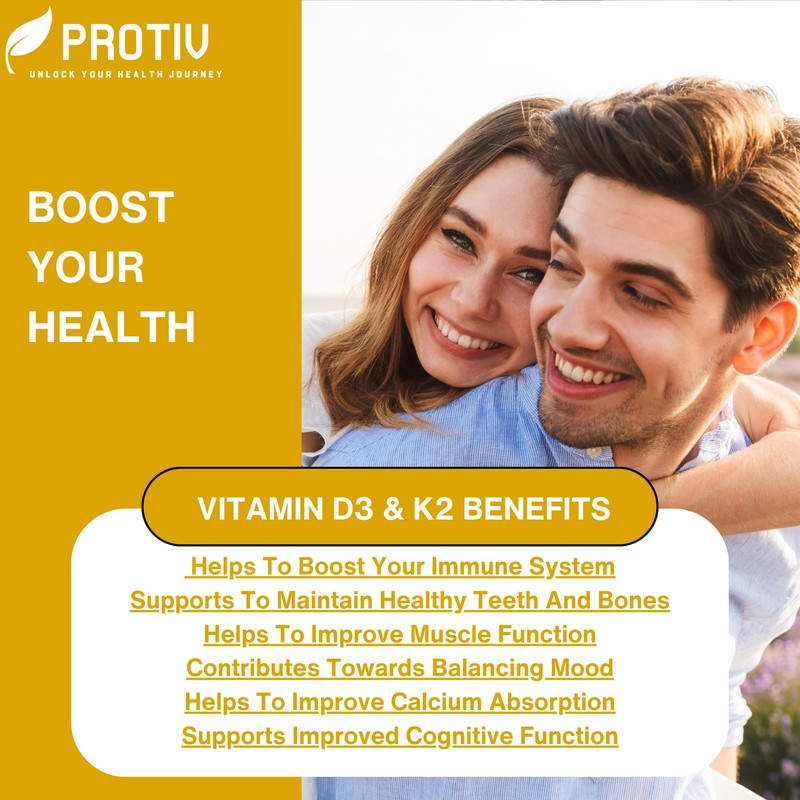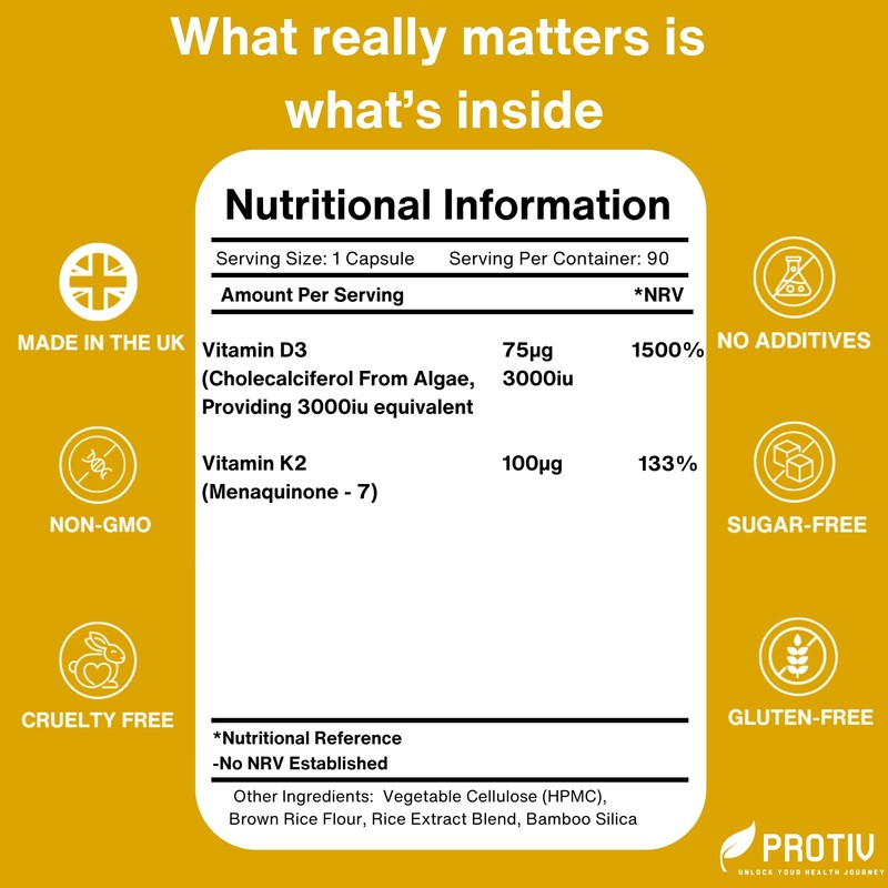 • High Potency Vitamin D3 & K2 - Protiv Nutrition Vitamin D3 & K2 supplement provide an optimum synergistic combination of Vitamin D3 3000 IU and Vitamin K2 100ug MK7 in one convenient daily capsule.