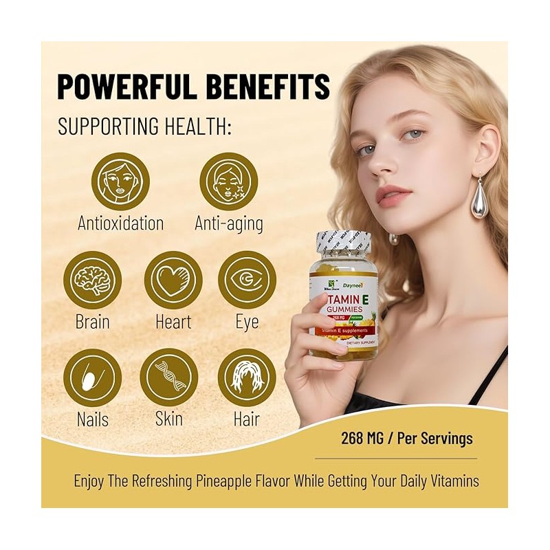 Vitamin E Gummies 268mg, Vitamin E Supplements for Adults Men & Women - Skin, Eye Health and Immune Function Support - Delicious, Vegan, Non-GMO | 60 Count