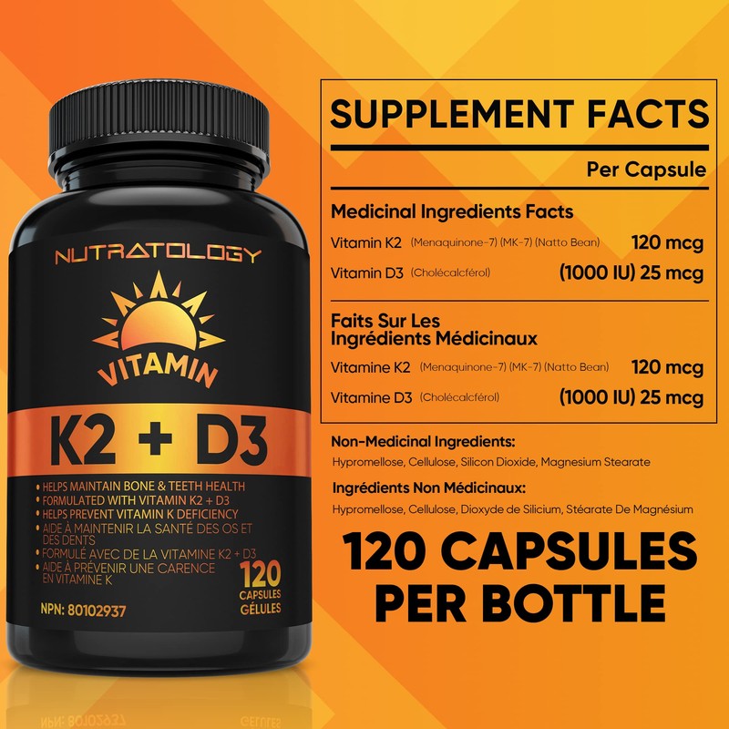 Vitamin K2 + D3 Highest Potency 120MCG/1000 IU - 120 Capsules - Helps Maintain Bone & Teeth Health - Formulated With MK-7 For Best Results - Immune System Support - Made In Canada