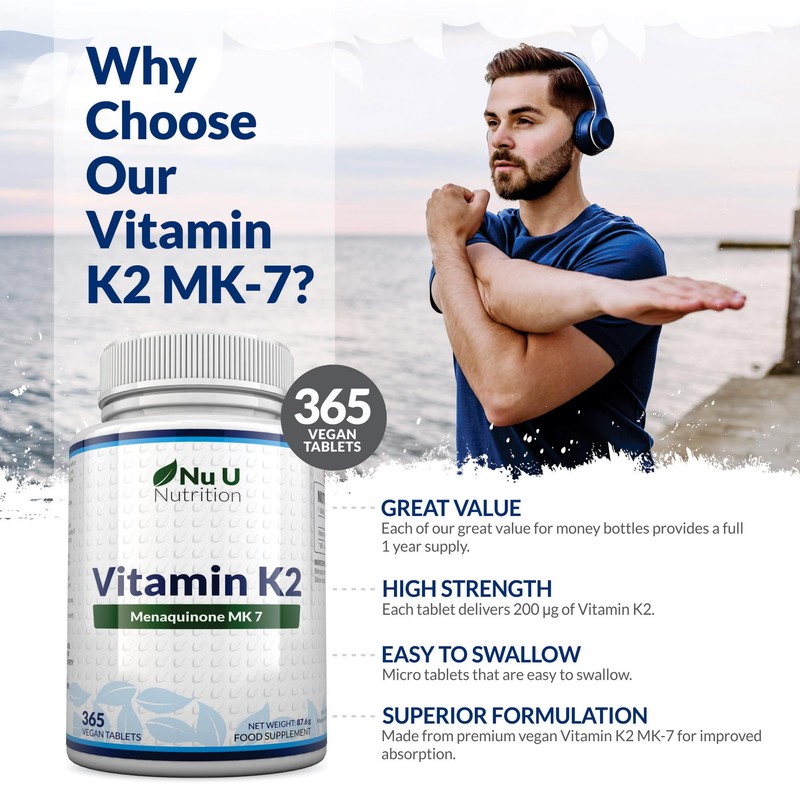 Vitamin K2 MK 7 200mcg - 365 Vegan Tablets (not Capsules) - 1 a Day - 1 Year Supply - High Strength Vit K2 Menaquinone - Made in The UK - Nu U Nutrition