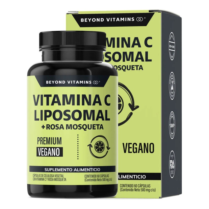 - Beyond Vitamins Vitamina C Liposomal con Rosa Mosqueta es un suplemento alimenticio premium diseñado para maximizar la absorción y efectividad de la vitamina C en tu cuerpo. Este producto combina 300 mg de vitamina C por cápsula con el poder de la rosa mosqueta, ofreciendo una fórmula avanzada y vegana para apoyar tu bienestar diario. Vitamina C Liposomal: Potencia y absorción mejorada Gracias a la tecnología liposomal, nuestra vitamina C se absorbe de manera más eficiente, permitiendo a tu cuerpo aprovechar al máximo este nutriente esencial. La vitamina C es conocida por sus propiedades y al combinarla con esta innovadora tecnología, se optimiza su biodisponibilidad y efecto en el organismo. Enriquecido con Rosa Mosqueta Hemos añadido extracto de rosa mosqueta a nuestra fórmula para potenciar los beneficios. La rosa mosqueta, rica en compuestos bioactivos, complementa la acción de la vitamina C, ayudando a mantener el equilibrio natural del cuerpo. Fórmula Vegana y Premium Este suplemento está elaborado sin ingredientes de origen animal, siendo completamente vegano. Además, las cápsulas de celulosa vegetal aseguran que el producto sea apto para todas las dietas y estilos de vida. Libre de conservantes y aditivos artificiales, cada cápsula de Beyond Vitamins está formulada para brindarte lo mejor de la naturaleza. Calidad Garantizada en Cada Lote Cada lote de nuestra Vitamina C Liposomal con Rosa Mosqueta es examinado y certificado con un Certificado de Análisis (CoA), garantizando pureza, potencia y consistencia. Fácil de Integrar en Tu Rutina Diaria Nuestras cápsulas están diseñadas para ser fáciles de tomar y perfectamente dosificadas, convirtiendo a Beyond Vitamins Vitamina C Liposomal en un complemento ideal para cualquier estilo de vida. Aviso legal