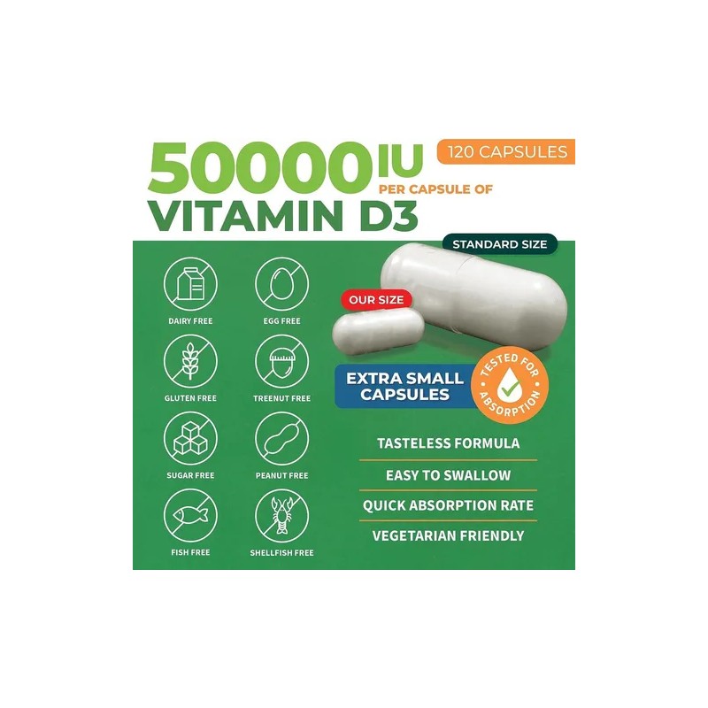 ¡Potencia tu salud desde adentro con la increíble Vitamina D3 de 50,000 IU! ☀️💊 Con 120 cápsulas en cada frasco, tienes un refuerzo poderoso para tu bienestar diario por meses 🗓️💪.