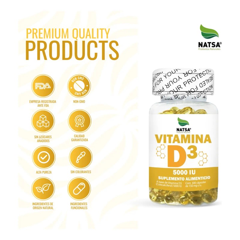 - Descubre los beneficios de la Vitamina D3 5000 IU, tu aliada para el bienestar diario. Mantener una vida equilibrada puede ser un desafío, especialmente cuando el ritmo diario impide obtener los nutrientes esenciales que el cuerpo necesita. La Vitamina D3 de Natsa ofrece una solución eficaz para complementar tu dieta y contribuir al correcto funcionamiento de tu sistema inmunológico y salud ósea. Formulada con ingredientes de calidad premium, cada cápsula proporciona una dosis efectiva de Vitamina D3, apoyando la absorción de calcio y fósforo para mantener huesos fuertes, mientras fortalece tu sistema inmunológico, ayudándote a enfrentar los desafíos de cada día. SOBRE EL PRODUCTO: