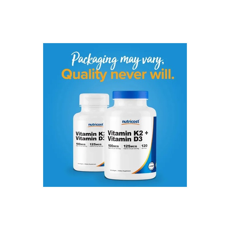 El suplemento de Nutricost combina Vitamina K2 (MK7) y D3 para apoyar la salud ósea y cardiovascular, mejorando la absorción y uso del calcio. En cápsulas blandas, es libre de gluten, lactosa y apto para veganos. Cada envase contiene 120 cápsulas (4 meses de uso). Se recomienda tomar 1 cápsula al día con alimentos.