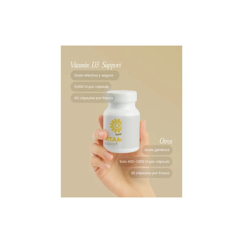 La Vitamina D3 Support de NUTRIADN es un suplemento esencial para quienes buscan fortalecer su salud ósea y mejorar su bienestar general. Cada cápsula contiene 300 mg de Vitamina D3, proporcionando 5000 UI por porción, lo que contribuye a la correcta absorción del calcio y al mantenimiento de sistemas inmunológicos saludables.