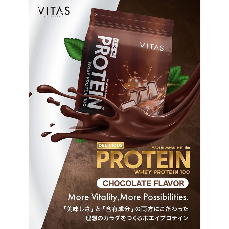 - 【VITAS デリシャスプロテイン チョコレート風味】美味しさ、溶けやすさ、成分にとことんこだわったプロテイン。厳選された乳清たんぱくを使用。毎日の栄養補給に最適で、トレーニングや美容をサポートします。